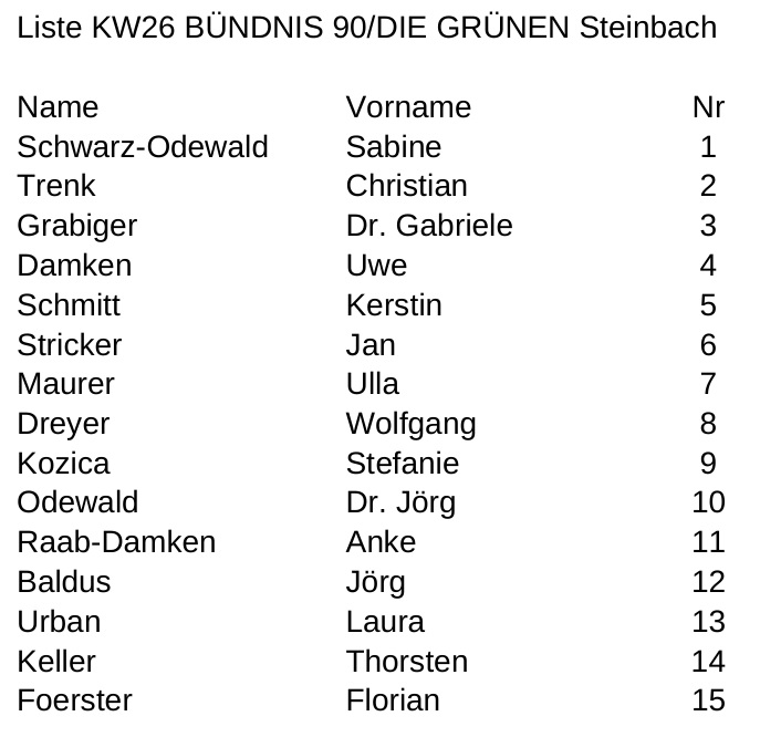 Am 19.11.2025 trafen sich die Steinbacher GRÜNEN, um ihre Liste für die Wahl zur Steinbacher Stadtverordnetenversammlung am 15. März 2026 aufzustellen. Das Ergebnis der Abstimmung ist eine starke Liste von Frauen und Männern, Jungen und Älteren, Parteimitgliedern und parteilosen Kandidat*innen, die sich für eine lebenswerte und klimagerechte Zukunft Steinbachs engagieren wollen.